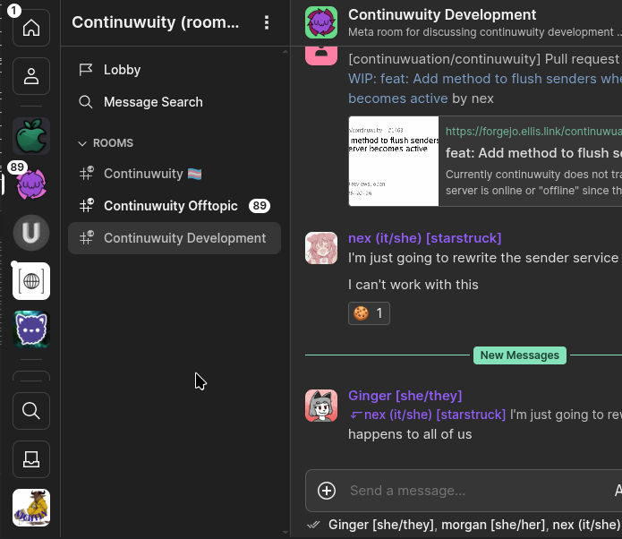Currently trying to squash a bug i've identified where joining, leaving, and re-joining prevents you from leaving a 2nd time (keeping you locked in) with a 403 error, "M_FORBIDDEN: Event is not authorized."